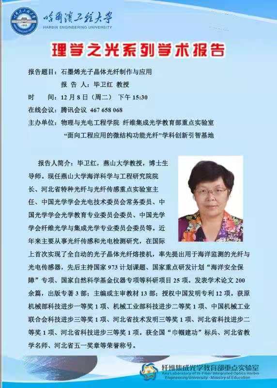 理学之光系列学术报告:石墨烯光子晶体光纤制作与应用